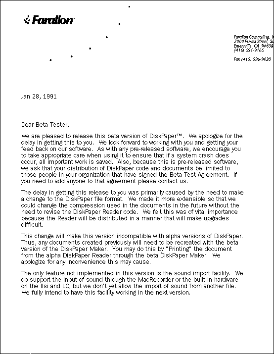 DiskPaper preserves not only QuickDraw and 72-dpi bit-mapped images of the original document, but also, optionally, PostScript and 300-dpi representations. The result, according to Farallon, is screen display and printed copy that exactly match the original document, whatever the resolution of the output device and even if the recipient does not have fonts used in the file.